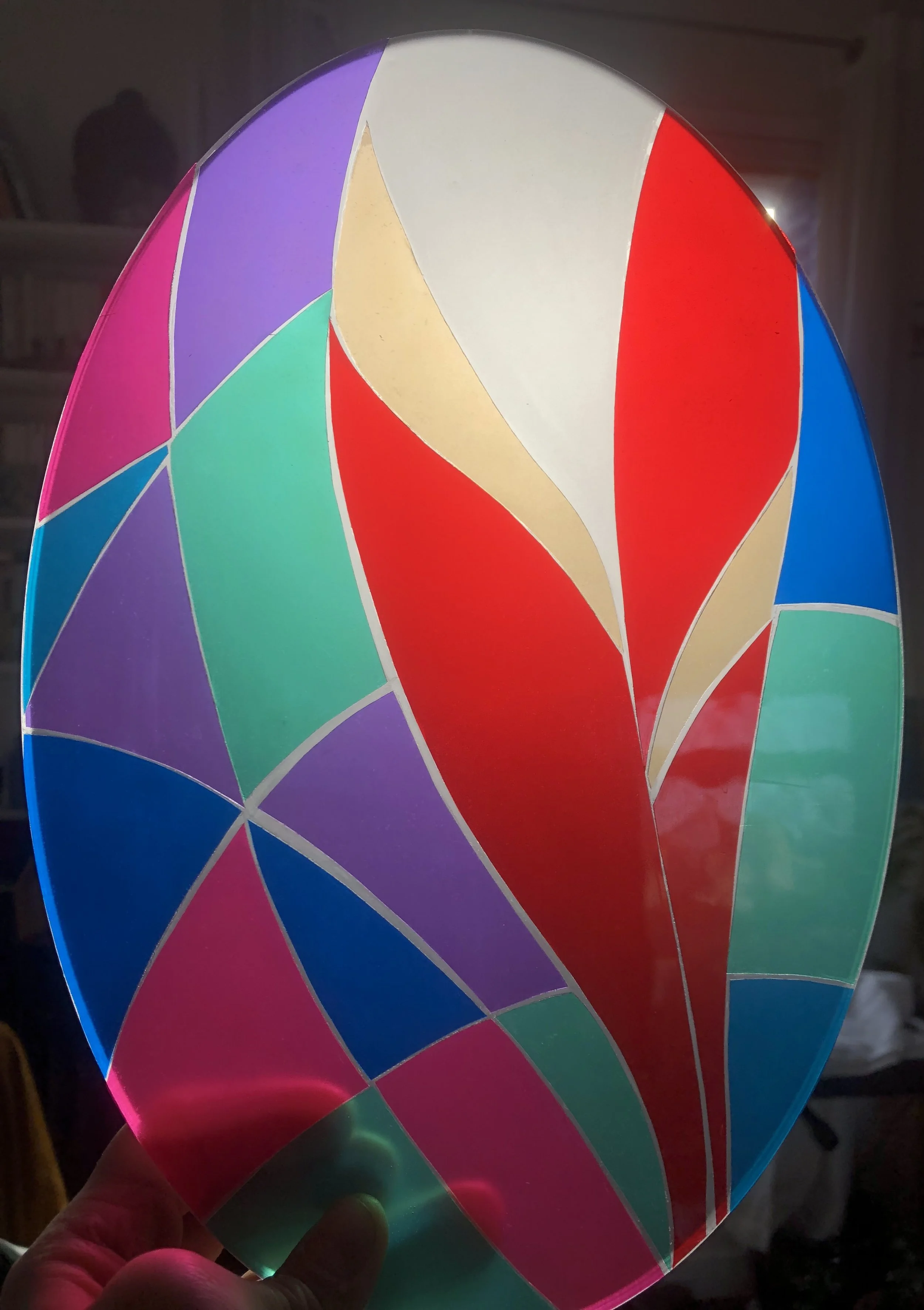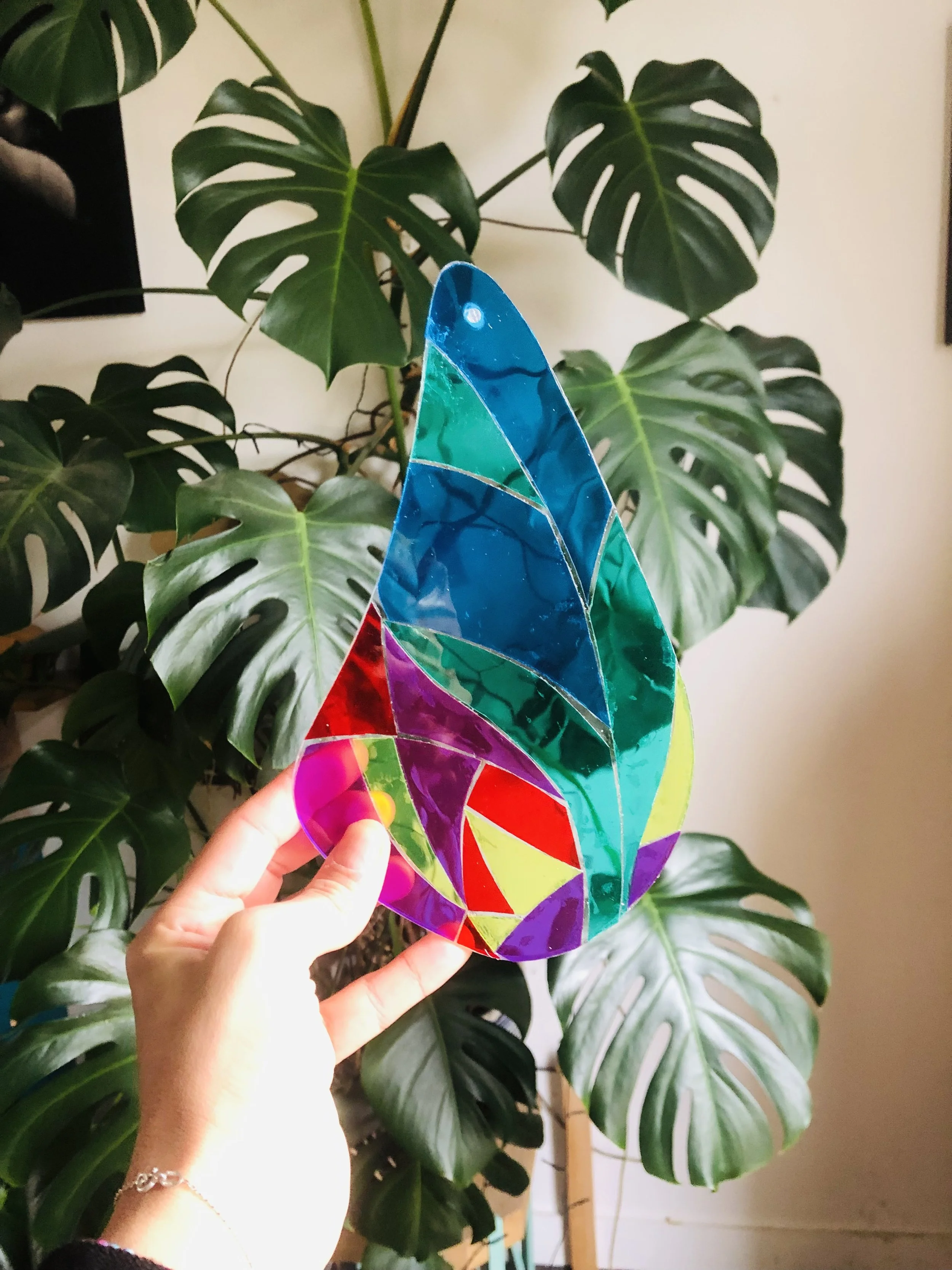 Un travail qui regroupe plusieurs matériaux : du chêne, du métal, du plexiglass, et des feuilles de gélatines pour la couleur ...